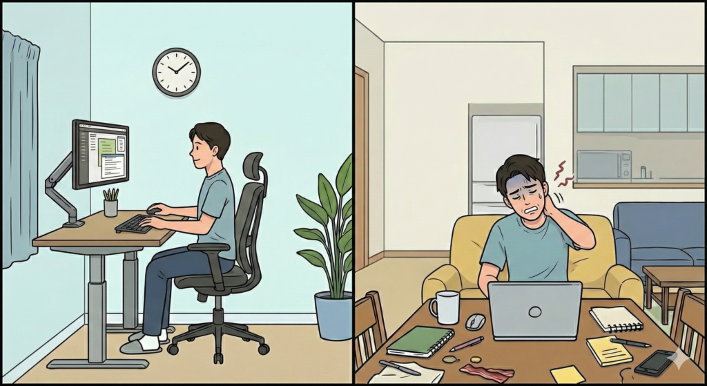 - 身体の悲鳴: カフェ風の低いテーブルと硬い椅子で作業を続け、腰痛や肩こりが慢性化する。