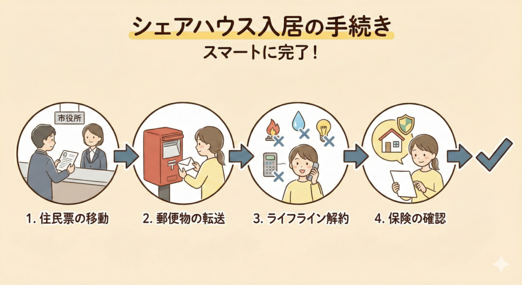 シェアハウスは水道・光熱費が「共益費」に含まれる定額制が多いため、個人での新規契約は不要です。ただし、旧居の解約(電気・ガス・水道)は忘れずに行いましょう。
