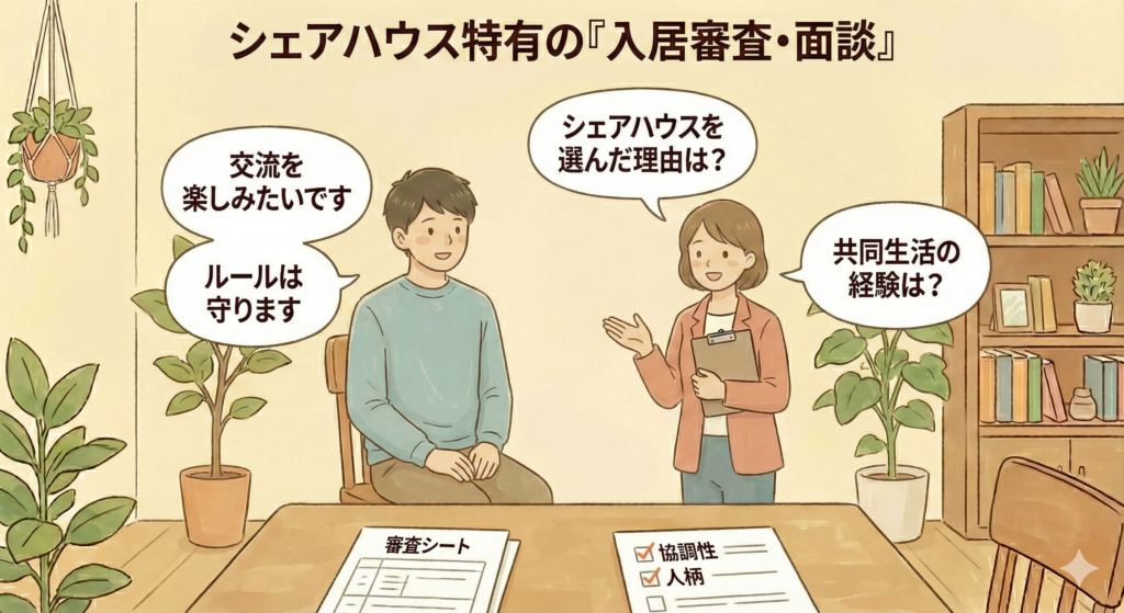 一般的な賃貸は「支払い能力」が主ですが、シェアハウス(特に良質な物件)には「面談」があります。