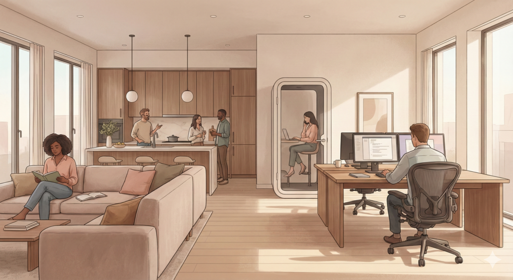 リモートワークやハイブリッドワークが完全に定着した今、シェアハウスは単なる「寝る場所」ではなく「仕事場」としての機能も求められています。