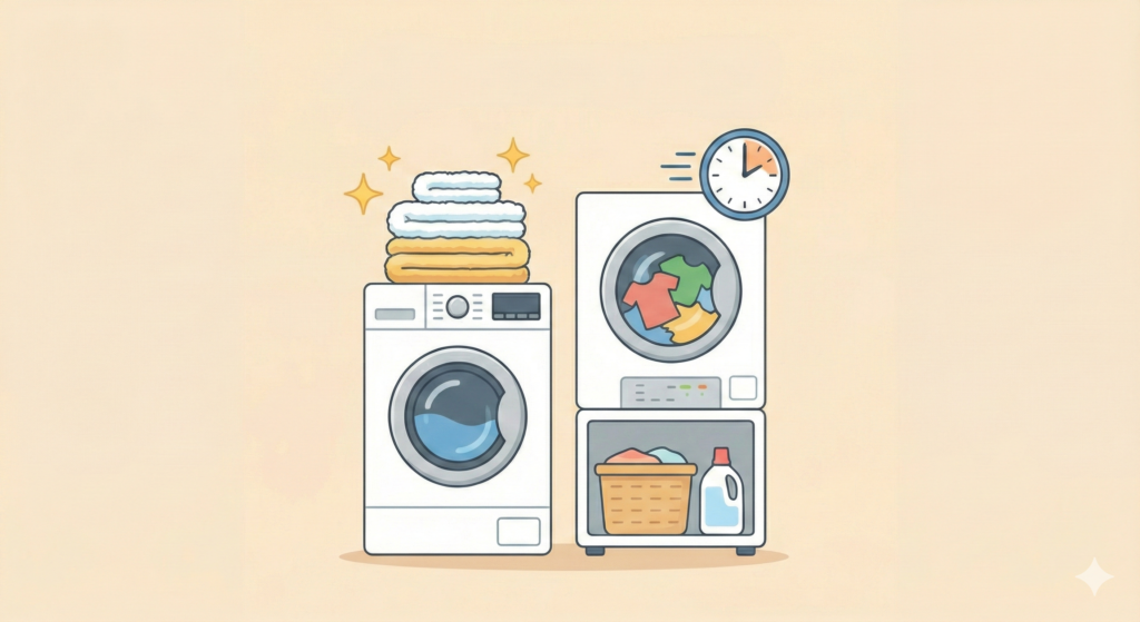 ベランダが狭い、雨が続くと干す場所がない、部屋干しの臭いが気になる…。洗濯に関する悩みは尽きません。また、洗濯機が終わっているのに前の人の服が入ったままで使えない、というのもよくあるトラブルです。