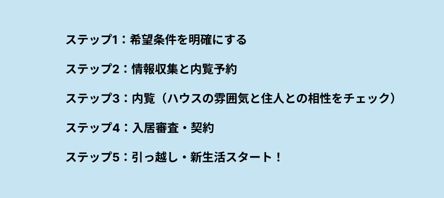 「シェアハウスに住んでみたい!」そう思ったら、次に知るべきは具体的な入居までのステップです。ここでは、初心者の方でも安心して進められる5つのステップを紹介します。