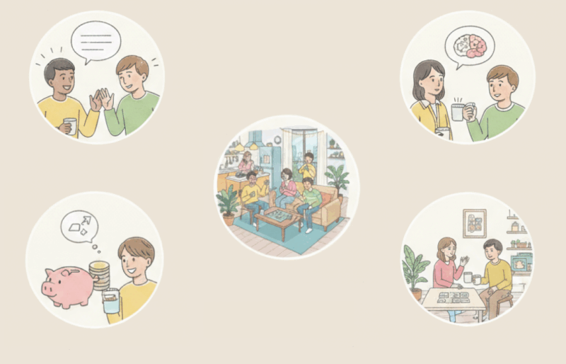 シェアハウス の魅力は家賃だけじゃない!孤独感の解消、新しい出会い、家事の負担減、いつでも清潔な環境、そしてもしもの時の安心感。一人暮らしでは得られない、意外な5つのメリットを解説します。ただ住むだけでなく、人生が豊かになるシェアハウスの暮らしをのぞいてみませんか?