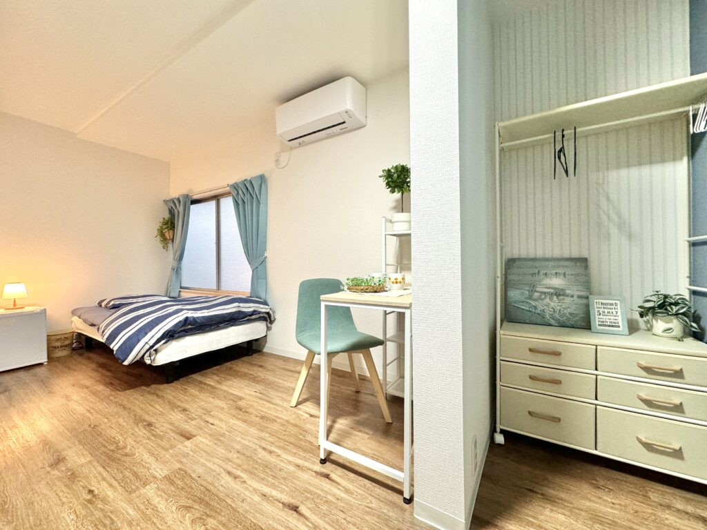 エアコン・机・椅子・ベッド・布団・収納ボックス