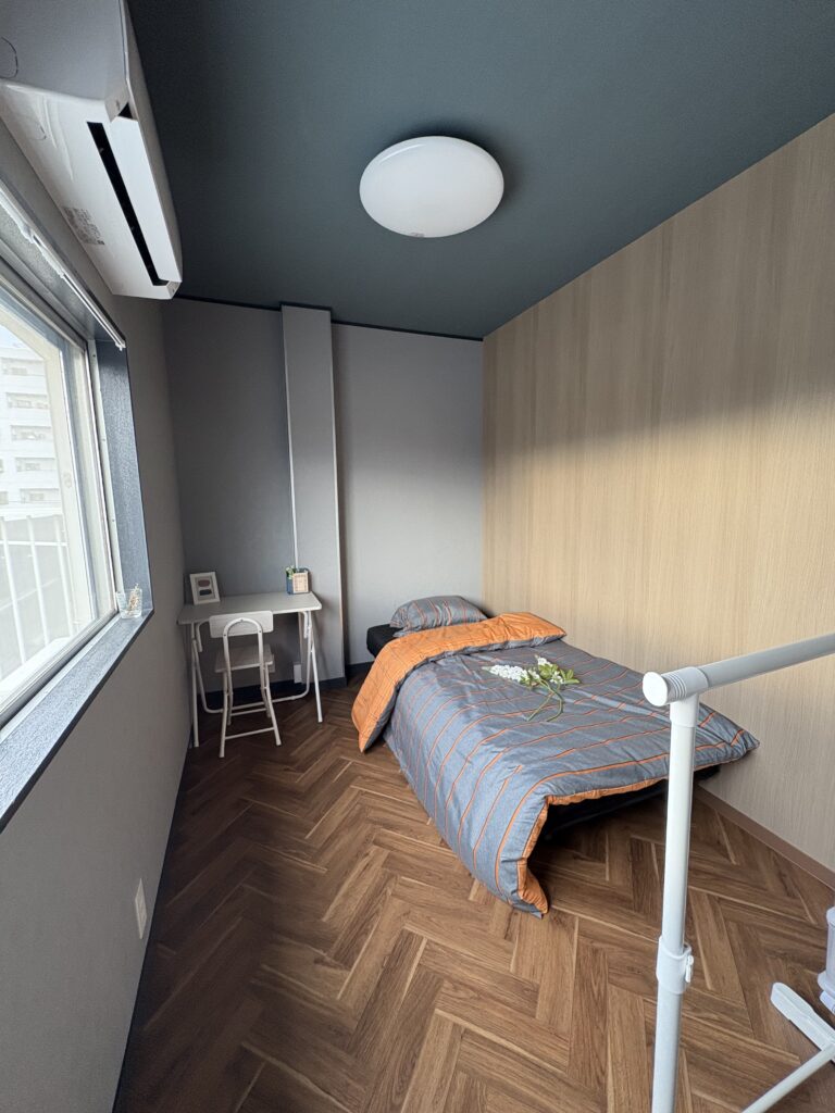 ベット、デスク、三段キャビネット、エアコン、ハンガーラック